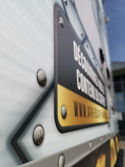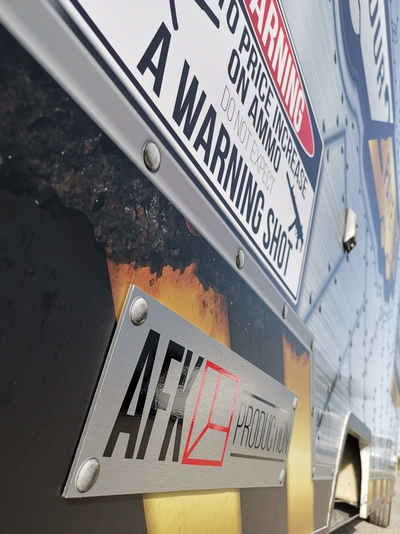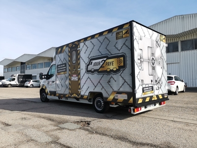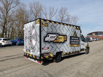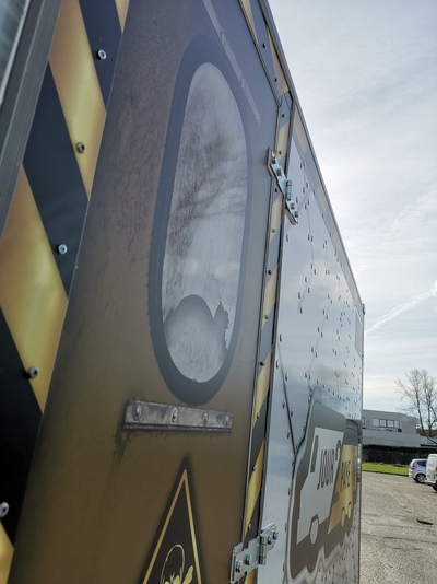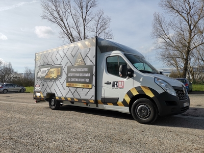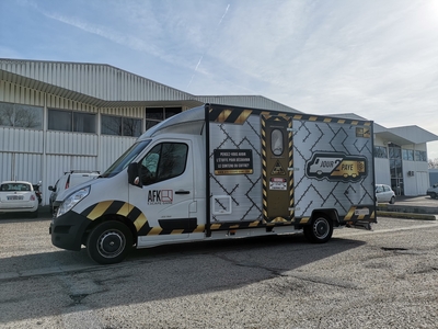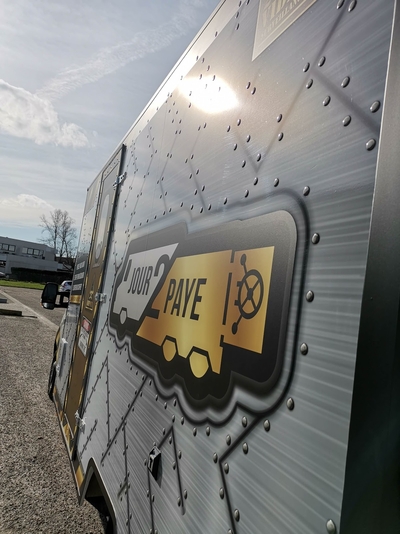 Projet hybride entre un foodtruck et une salle d’Escape Game, le concept AFK propose une expérience interactive de jeux dans un espace très réduit … 20 m3. Un covering complet caisse et cabine avec des expérimentations telles que des faux rivets en doming vinyl effet métal, un design indus conçu par notre studio graphique, fabrication et pose en nos ateliers par nos techniciens-poseurs agréés.