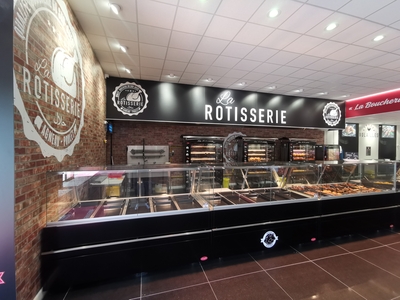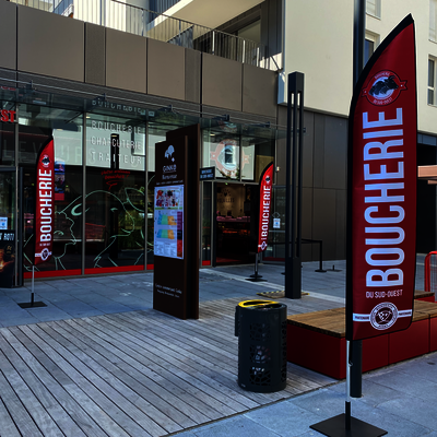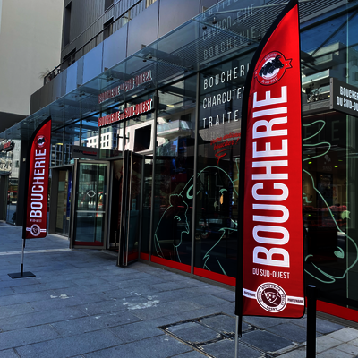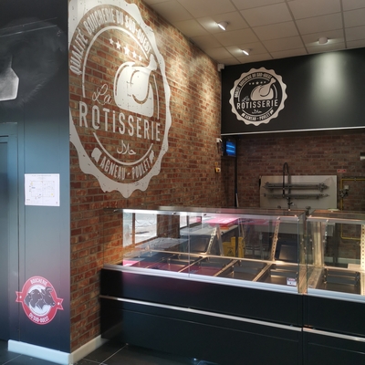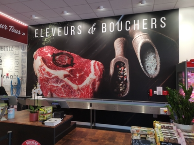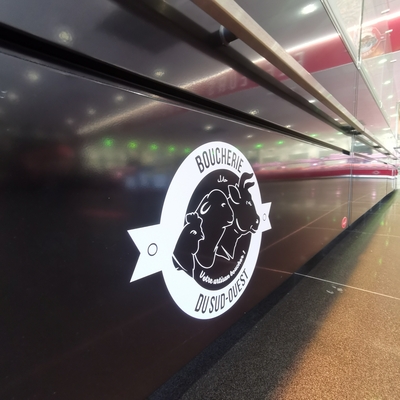Fort de 20 ans d’expérience, c’est en 2002 que Mondheur MAHDI (passionné par le métier de boucher comme son père), ouvre sa première boucherie halal dans le quartier Saint Michel. Le succès est au rendez-vous car l’accent est mis sur la qualité et le prix. Fort de cette réussite, il ouvre quelques années après, un second magasin à Lormont, au Centre Commercial des 4 Pavillons. C’est à partir de ce moment-là que M. MAHDI fait appel à LOKi. En 2018, il nous propose de retravailler l’identité graphique de ses commerces avec le souhait de toucher une clientèle élargie. Cela commence par la refonte du logo BOUCHERIE DU SUD-OUEST. Cette étape passée, nous avons repensé la décoration extérieure et intérieure de la boucherie. En extérieur avec une enseigne lumineuses LED en point par point, des logos en PVC relief montés sur des tôles pliées laquées en noir. Enfin, une déco élégante des baies vitrées avec la reprise d’éléments de l’identité graphique. En intérieur, nous avons voulu une décoration sobre et raffinée, composée de belles photos murales pour mettre en avant les produits. L’habillage des vitrines réfrigérées et l’ajout dans les rayons, d’étiquettes prix au design clair et soigné terminent la transformation. Cette belle réalisation a décidé Mondheur MAHDI à nous faire de nouveau confiance pour les 2 nouveaux projets d’envergure qui ont suivi. BSO Ginko en 2020 et BSO Mérignac Soleil en 2021 où la part belle a été faite à la décoration murale de grand format. Sans oublier l’habillage du siège de l’entreprise, le Groupe MAHDI situé à Bruges. Enfin dernièrement, le rafraîchissement de la première boucherie, BSO St-Michel. C’est une belle réussite que notre collaboration qui a débuté il y a 5 ans, et ce n’est pas terminé car Mondheur MAHDI est un homme qui fourmille d’idées et de projets !