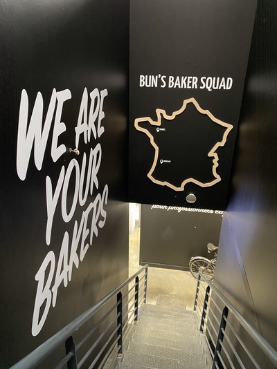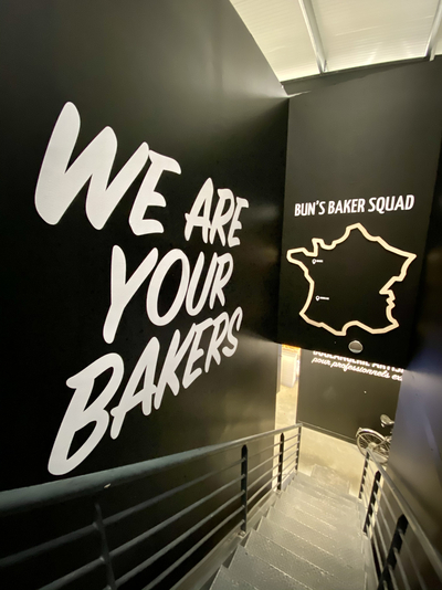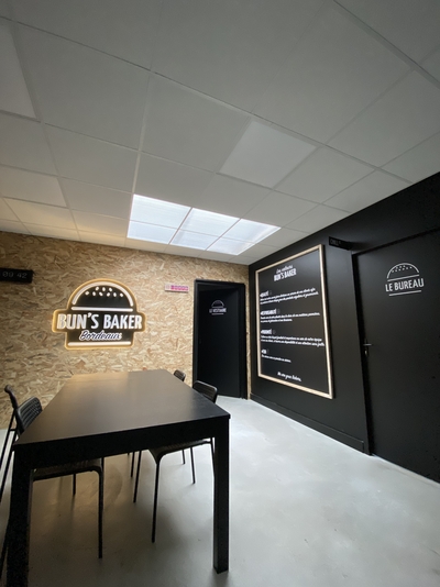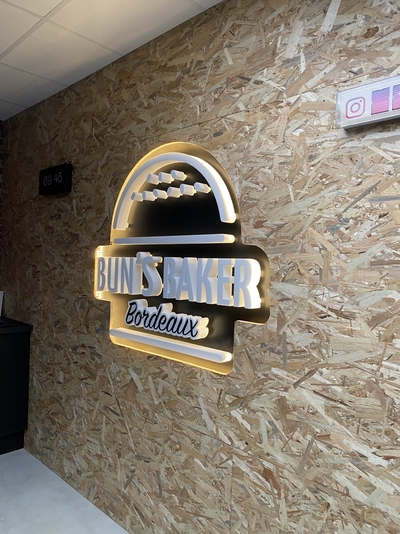Comment créer une atmosphère de fabrication locale, d’authenticité artisanale pour la jeune franchise BUN’S Baker ? La question a été confiée à LOKi : bonne idée, nous avons trouvé la réponse ! L'aménagement de l’atelier de fabrication de leur fameux Bun’s revisité par un plaquage en OSB ajouré avec une incrustation du logo en polystyrène pour le volume et un rétro-éclairage par LED 2700K pour un blanc chaud, un contour de carte de France découpée dans du Bouleau d’épaisseur de 30 mm, un compteur de followers et des marquages muraux en DAO, vinyle à colle renforcée pour une tenue optimale de leur signalétique décorative, cahier des charges et charte graphique prêtes pour le « Manop », tout est en place pour la multiplication des Bun’s Baker.