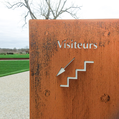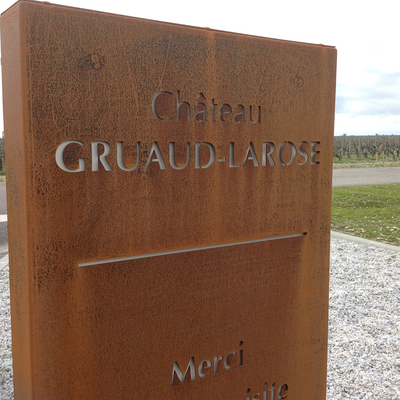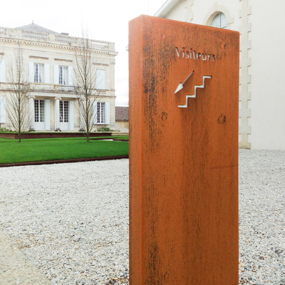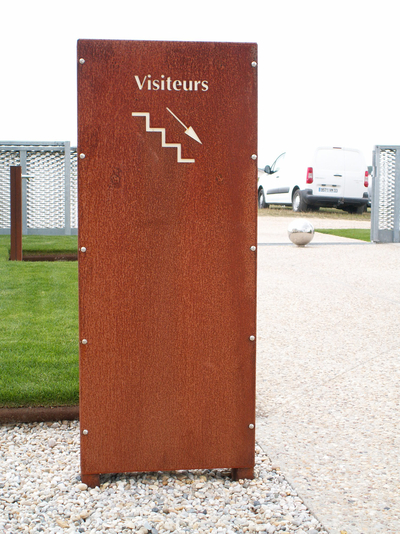 C’est un domaine prestigieux, le Château Gruaud Larose qui nous a sollicité pour la signalétique extérieure de sa propriété. En effet, la célèbre appellation Saint Julien dans le Médoc, a demandé à l’agence LOKi de créer une signalétique en phase avec les aménagements imaginés par le responsable des extérieurs. La matière (et plus précisément le corten), a été le dénominateur commun à l’élaboration de toute la signalétique. C’est donc un ensemble cohérent composé de totems ajourés, de plaques murales ajourées, et de sphères en inox que nous avons conçu et implanté aux 4 coins de la propriété. Pour les jardins, ont été fabriqués des piquets « aspect corten » en impression numérique où figurent les noms des rosiers et autres plantes qui ornent les magnifiques extérieurs du château. Merci encore aux personnes qui nous ont fait confiance pour ce beau projet. Quand on connaît la devise du Château Gruaud Larose : « Le Vin des Rois, le Roi des Vins », le résultat final devait être à la hauteur ! Les photos en témoignent…