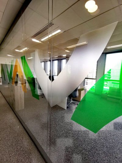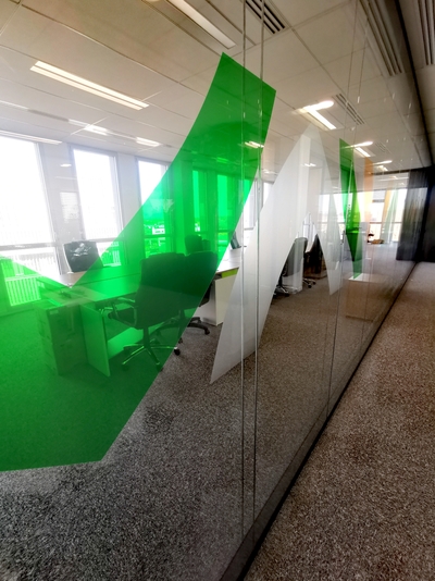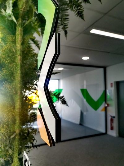 Sur le mur végétal, un tableau en plexigas noir avec découpe à la forme et défonce du lettrage. Pour les décorations des cloisons de bureaux vitrées, notre Studio de création a choisi d'utiliser les films adhésifs Hexis Cristal Clear, associé à de la découpe de vinyle teinté masse, pour un résultat tout en contraste mat et brillant.