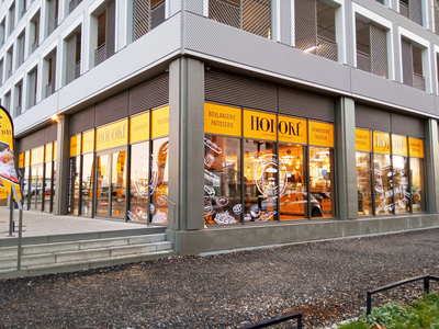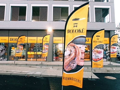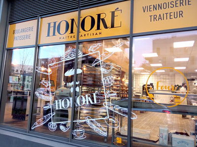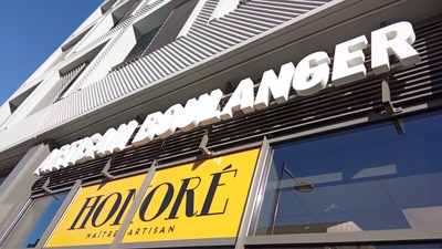 Honoré est une création avec un grand « C ». Pour cette boulangerie artisanale installée sur Pessac et Bordeaux (près du pont Chaban Delmas), notre studio graphique est parti de rien, d’une feuille blanche. L’idée était de créer une nouvelle enseigne avec un nom qui lui soit propre. L’un de nos graphistes a alors proposé le nom et le logo à notre client qui a rapidement été emballé. Par la suite, nous avons créé toute la charte graphique pour les emballages (qui sont nombreux pour une boulangerie). Pour le projet du Bassin à flots, nous avions des contraintes de taille d’enseigne à respecter. Nous avons, (commes les commerces voisins), proposé des lettres boîtiers lumineuses de faible consommation énergétique. Nous avons ensuite créé les illustrations et visuels pour l’habillage des baies vitrées en vinyle imprimé et découpé. Pour compléter l’ensemble, nous avons réalisé des voiles imprimées pour le parvis ainsi que la personnalisation des vitrines réfrigérées pour les boissons. Honoré est aujourd’hui un lieu privilégié pour tous ceux qui apprécient le « fait maison ». Une fierté pour LOKi dont la part créative a été totale dans ce projet.